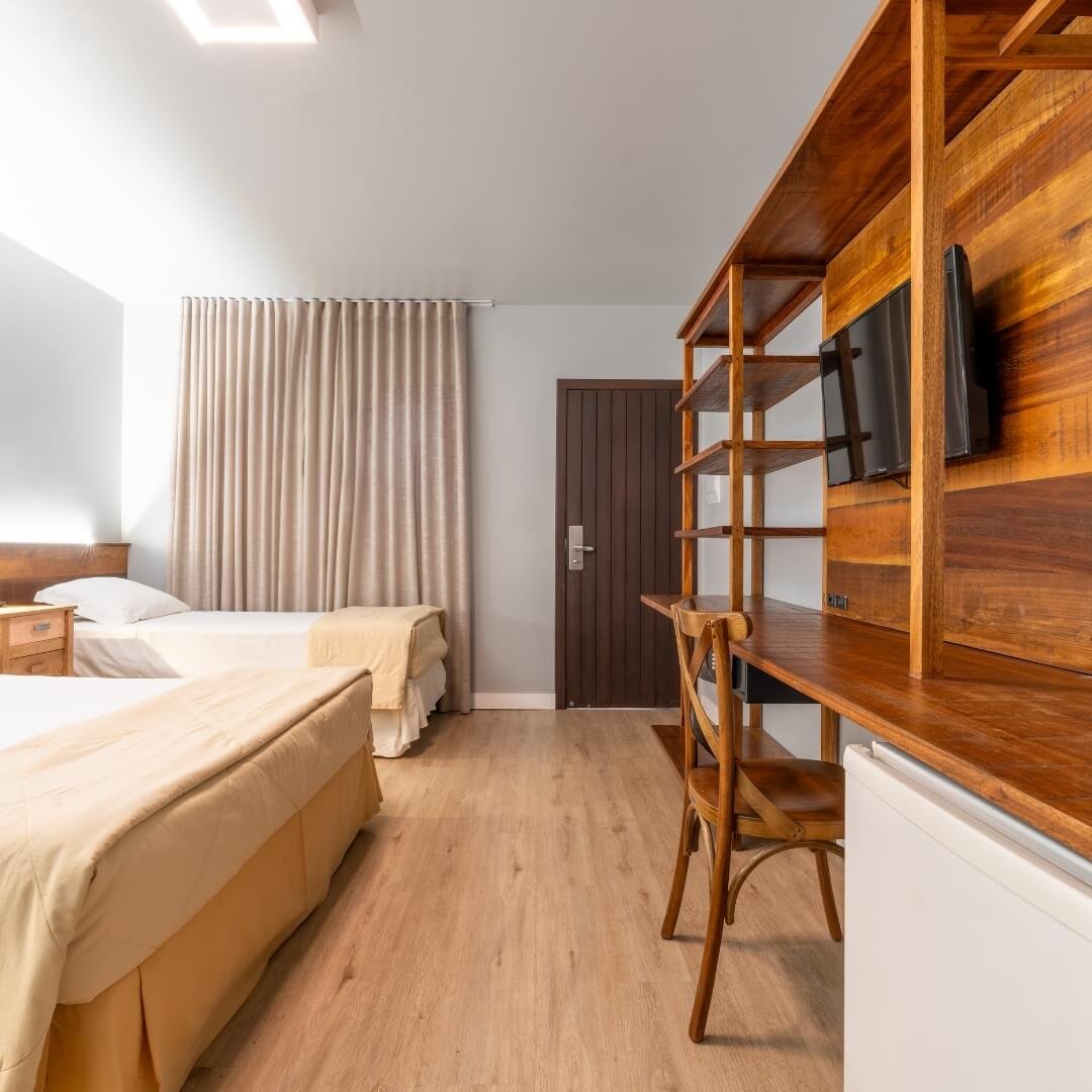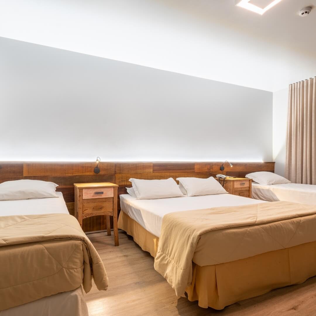 Com capacidade para 1 casal e até 2 crianças, nossos Apartamentos Luxo oferecem conforto e comodidade. Todos contam com banheiro privativo, 1 cama de casal e 2 camas de solteiro, ar-condicionado, telefone, frigobar, secador de cabelos e televisão.